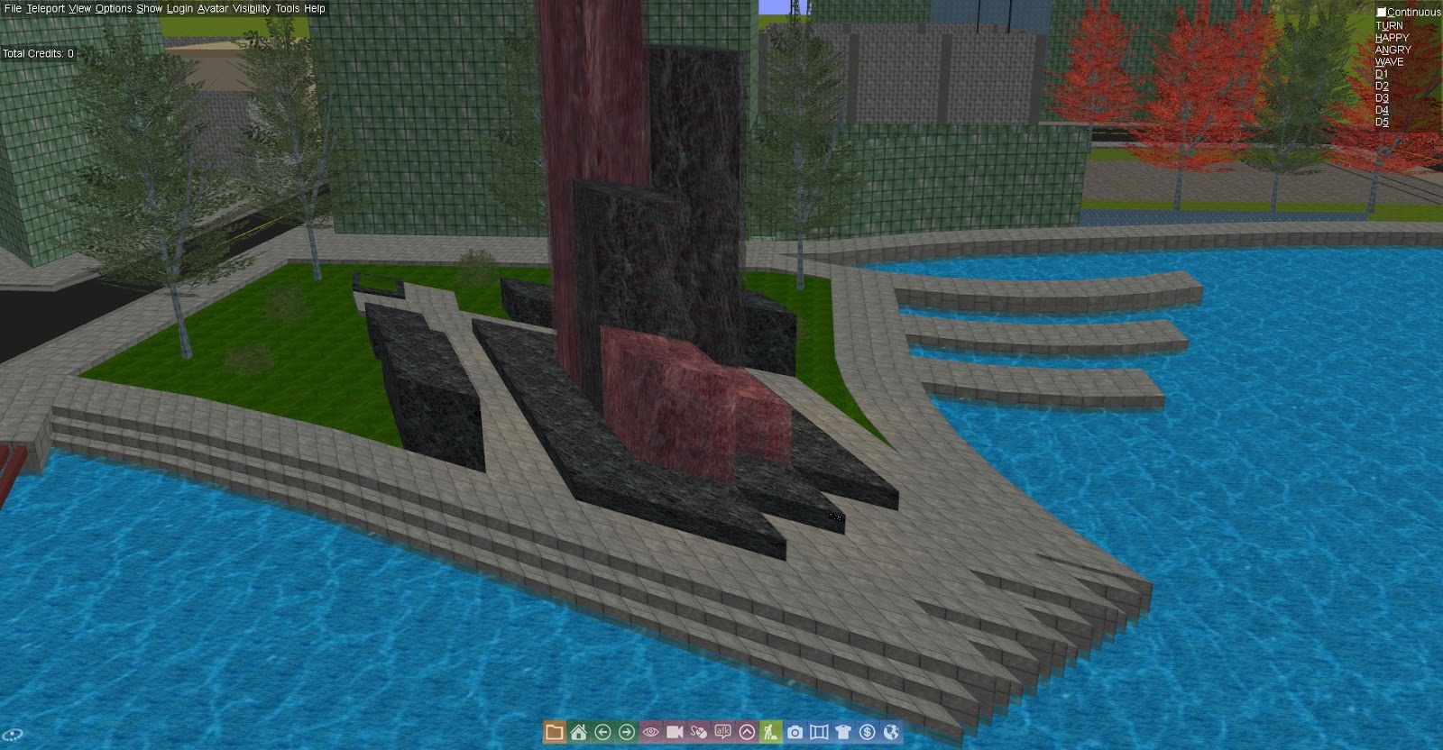 There was one build that I did manage to at least complete initially: a sculpture that I've named "Monolith Rise". It consists of a grouping of glossy monoliths that increase in height and alternate in texture. The base of the sculpture is lit with a flickering gold light to better distinguish the sculpture from the ambient lighting of the surrounding world. The entire sculpture is surrounded by sheared sidewalk in a park scene: