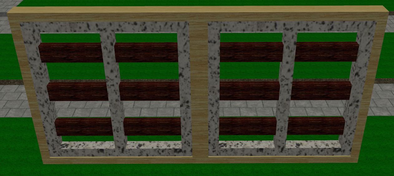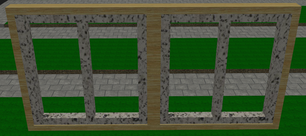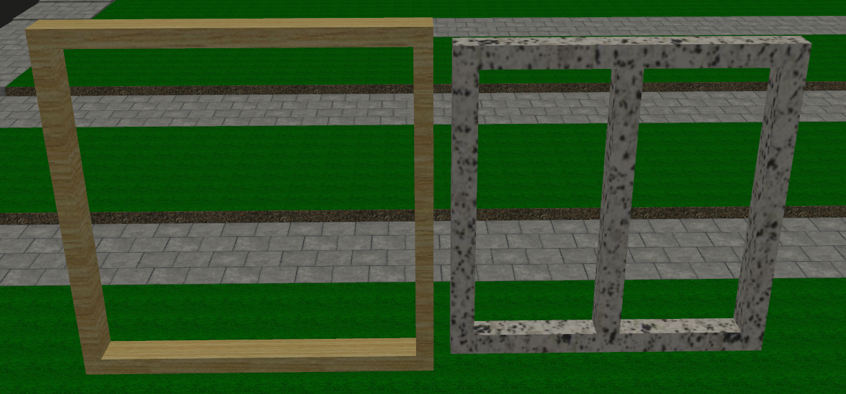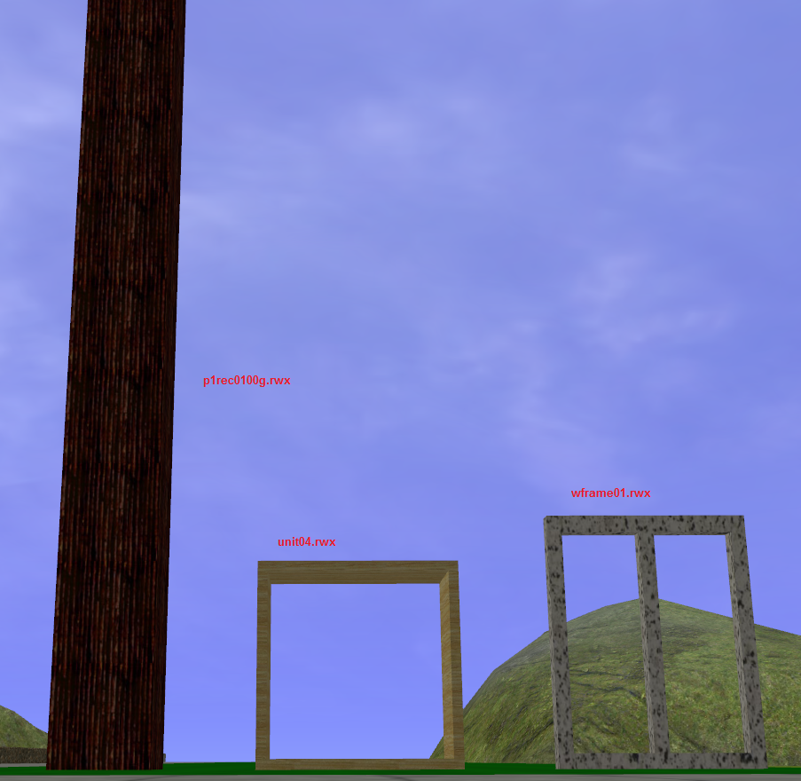 For my main building frame piece, I selected Unit04.rwx as it is a cube with some depth. For some thinner detailing that could make a believable 'wall' and window ceil, I chose wframe01.rwx. For further detailing, I chose p1rec0100g.rwx for some simple beams in my facade.