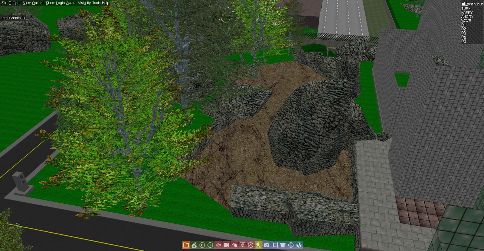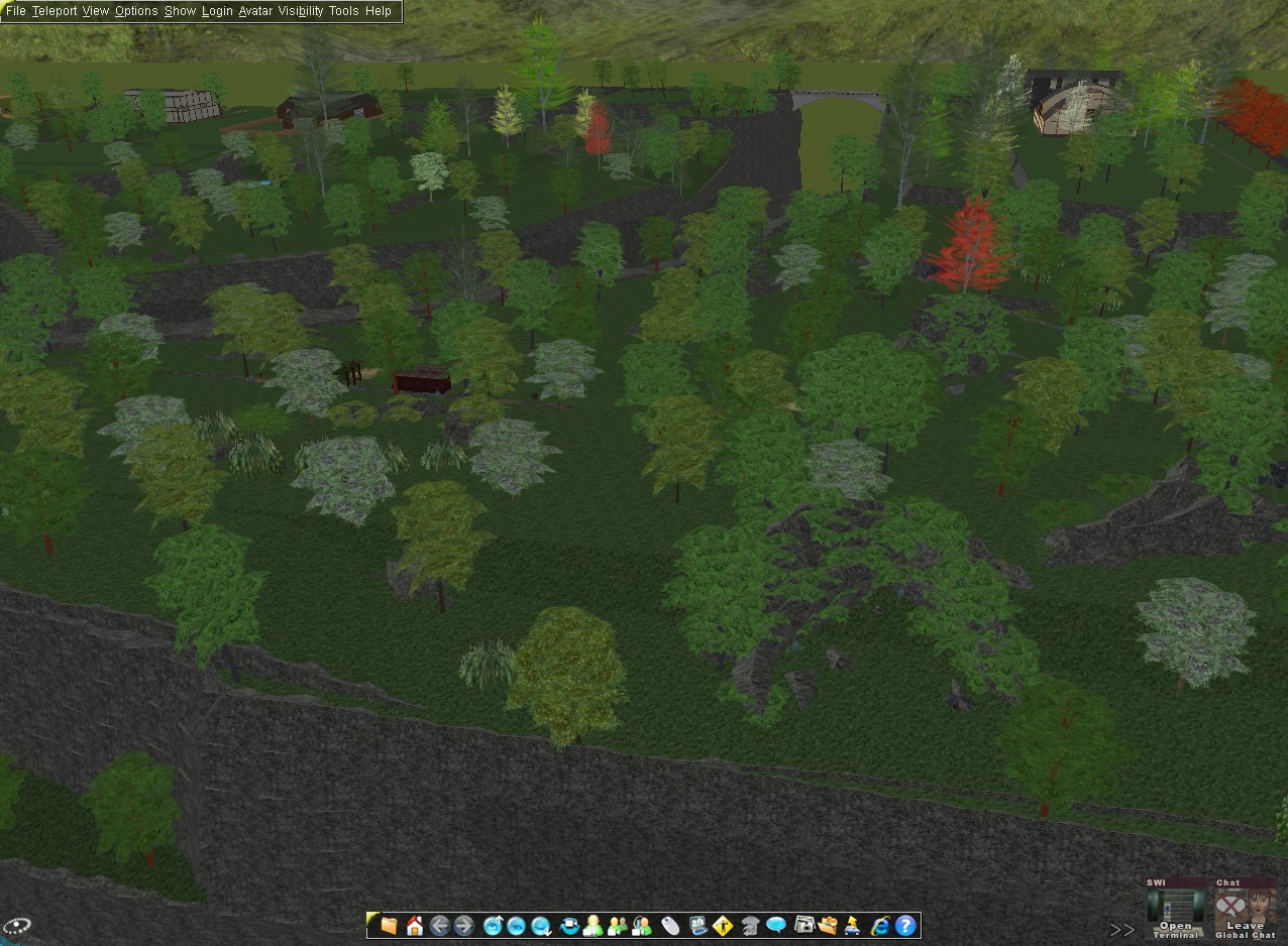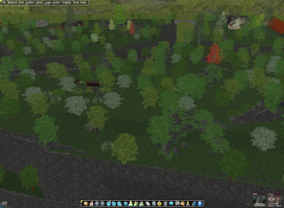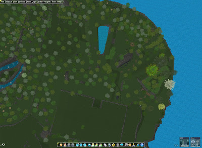 I've spent much of this week 'capping off' the landcover by connecting varying planes, by filling in fields that I didn't intend to build on with trees and rocks, and by placing geometries for buildings that I do intend to complete.