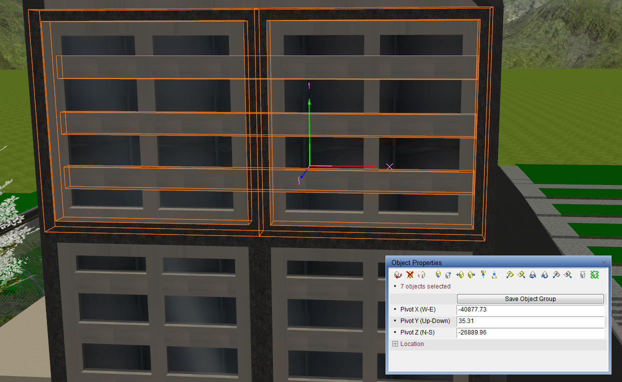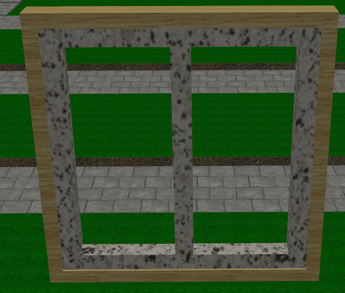 With these objects selected, we can begin scaling them to be very wide, very tall, and very thin, and then attempt to assemble them into a believable facade. I scaled the Unit04.rwx to match a 10x10 meter space and scaled the wframe01.rwx to fit within that space. Once I had this scale set, we can begin to see the facade take form: