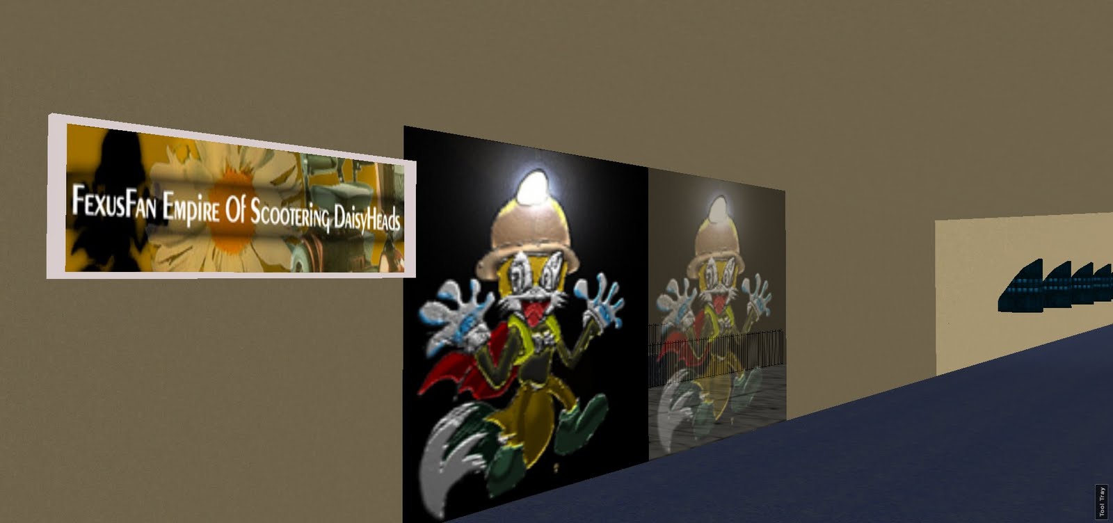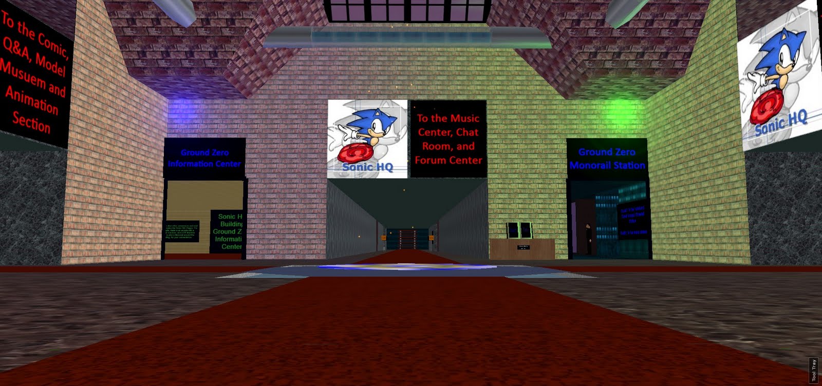 The building featured a room for every major sub-page, with signs that linked to the site acting as a visual directory. Many of these links are now dead, although you can still navigate to them via archive.sonic-hq.net. In-jokes (scootered daisy-heads) dot the halls between the informative rooms.  There were many rec-rooms, an intricate monorail system, and also a hotel for visitors from the forums to leave their mark in the world.  Some went further and made builds out in AWTeen.