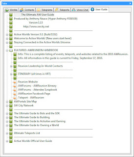 The genesis of the User Guide project actually came out of my ongoing work with the ActiveWiki. I wanted a solution to integrate the knowledgebase we had established on the wiki since 2006 into the Active Worlds Browser, while at the same time exposing the specific resources to a larger audience. In SW City we had tooled around with the user guide as a solution for a tabbed teleports list, but the idea never really took. After some drafts, I decided to pick up on the usefulness of the tabbed folders to create instructional guides that were intuitive to follow by opening and closing folders.