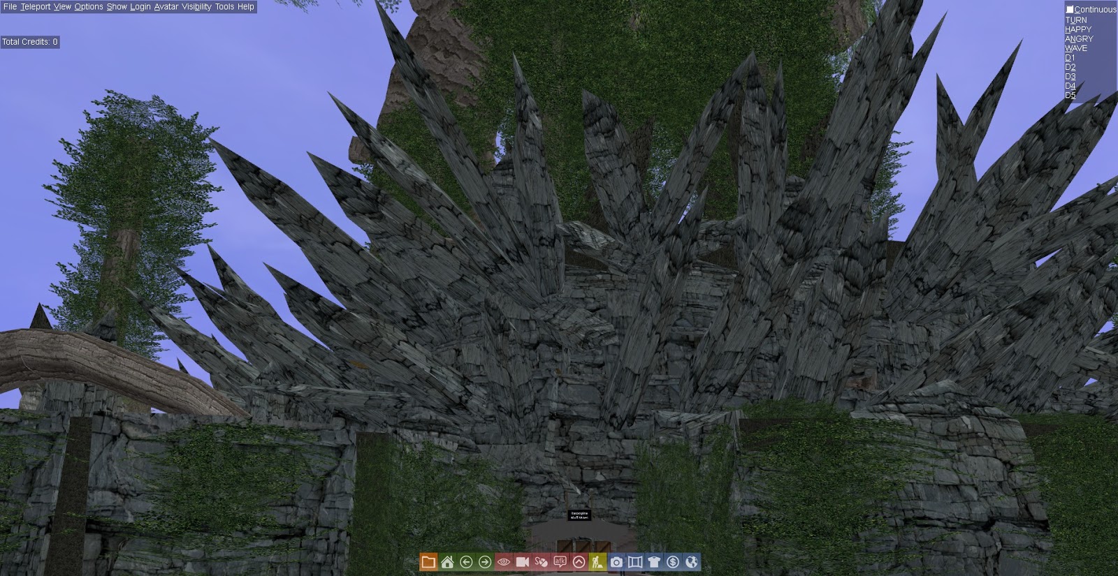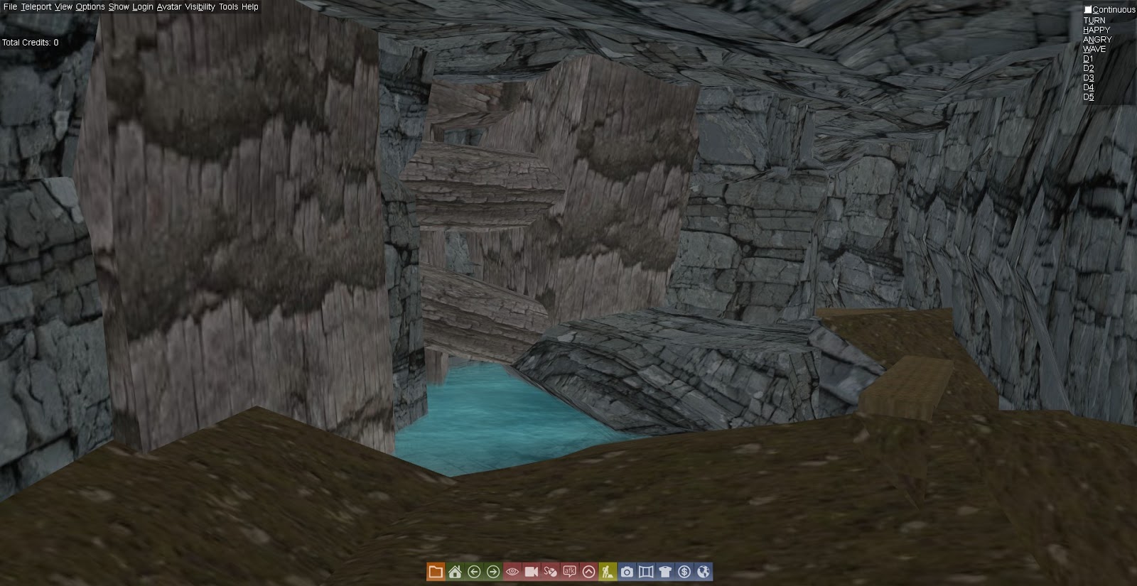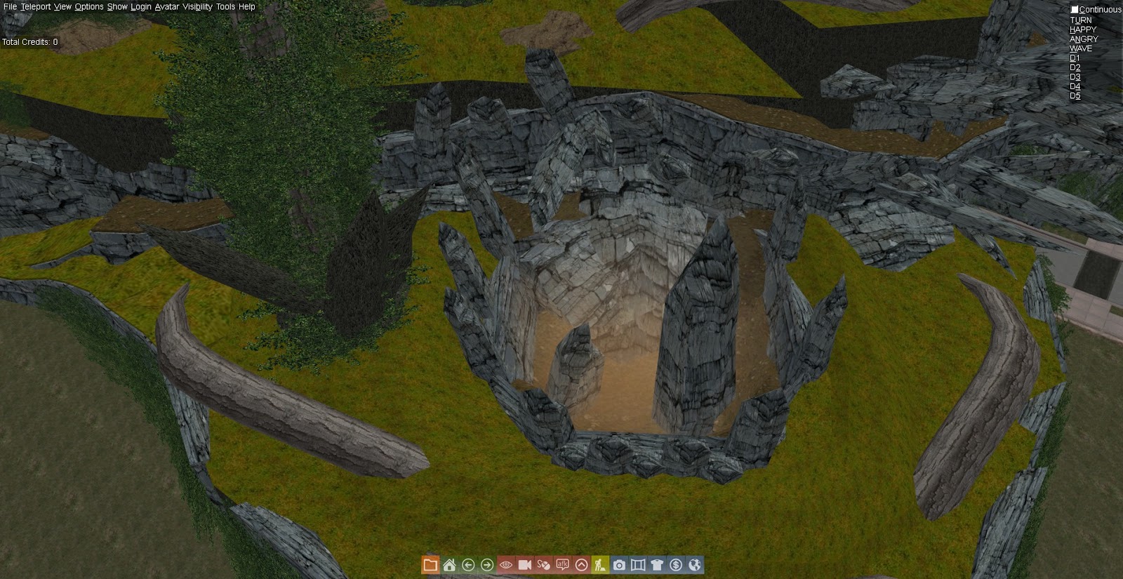| A view inside the cave. I used water and steam effects here, and also used some of the same tricks for the terrain spikes to create thin roots protruding into the cave. |